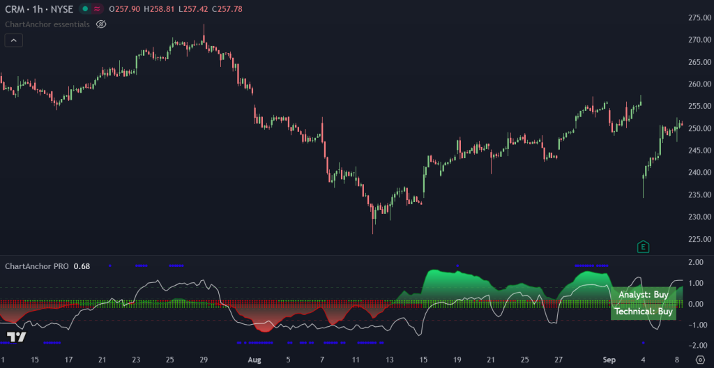 Even on a 1-hour chart, the framework holds: the white technical balance, the green/red trend band, and the four micro-dots give you the same read—only quicker.