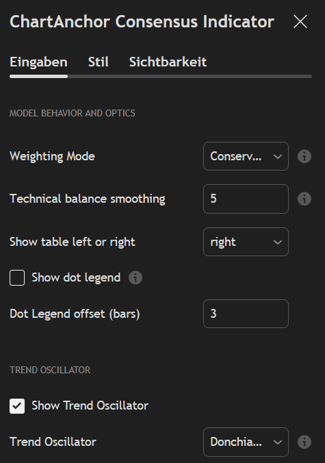 The 4 Dots represent proven thresholds and key levels derived from long-term analysis. They function as a visual progression system: the user sees, step-by-step, how relevant technical key levels change and shift. This unique transparency and clarity in threshold assessment is one of the distinct advantages that makes ChartAnchor Consensus the probably best TradingView Indicator for real-time market validation.