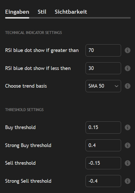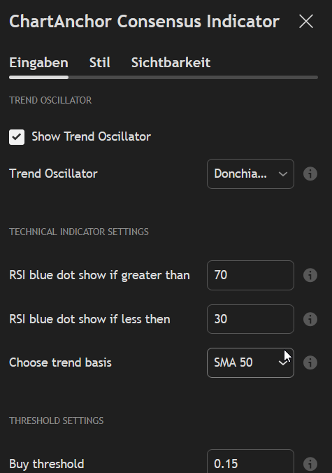 Select the trend oscillator (Supertrend • RSL • Donchian-Pos) and define the blue-dot RSI threshold.