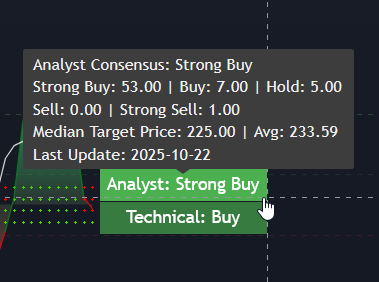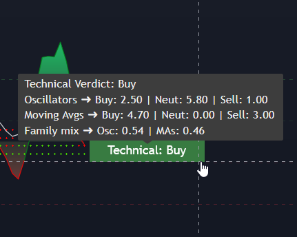 The combined Analyst verdict and Technical verdict with hover tooltips for analyst breakdown (SB/Buy/Hold/Sell/SS, target prices, etc) and the technical mix (oscillator vs MA shares, weighted counts).